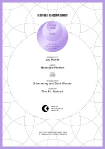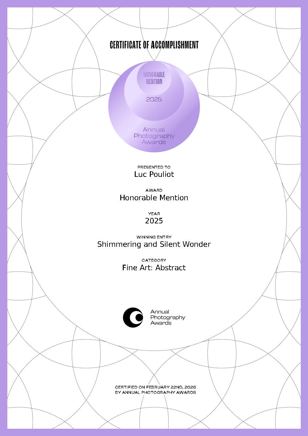 Distinctions Quelques prix remportés au fil des saisons Mention d’honneur« Beaux-Arts : Abstrait »Annual Photography Awards2025Voir la collection de photos de bulles de savon Mention d’honneur« Prédateur »Club Photo BlainvilleHiver 2025 Prix BRONZE« Nature : Macro et Micro »Annual Photography Awards2024Voir la collection de photos de bulles de savon Mention d’honneur« Nature : Macro et Micro »Annual Photography Awards2024Voir la collection de photos d’insectes Prix OR« La dernière étreinte »Club Photo BlainvilleAutomne 2024 Prix ARGENT« Révérence »Club Photo BlainvilleAutomne 2024 Grand Prix PPL« Vu d’en haut »« Le saut de l’ange »Passion Photo LaurentidesAutomne 2024 Mention d’honneur« Nature »« L’équilibriste »Salon numérique de l’ACAPPrintemps 2024 Mention d’honneur« Nature »« Bulle de cristal »Salon numérique de l’ACAPPrintemps 2024 3e Prix du Mérite« Insecte »« Bulle de cristal »ACAPPassion Photo LaurentidesAutomne 2023 Prix OR« Bulle de cristal »Club Photo BlainvilleAutomne 2022 Prix BRONZE« Face à face »Club Photo BlainvillePrintemps 2021 Mention d’honneur« La belle et la bête »Club Photo BlainvilleAutomne 2019 Sainte-Thérèse (Québec) Envoyez-moi un courriel